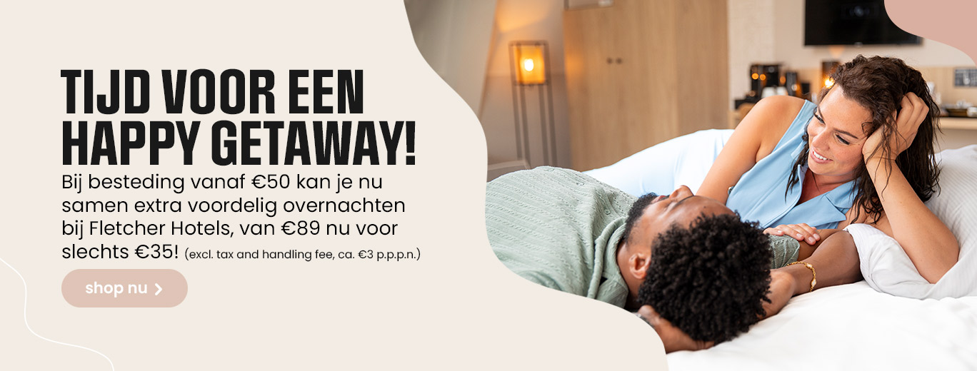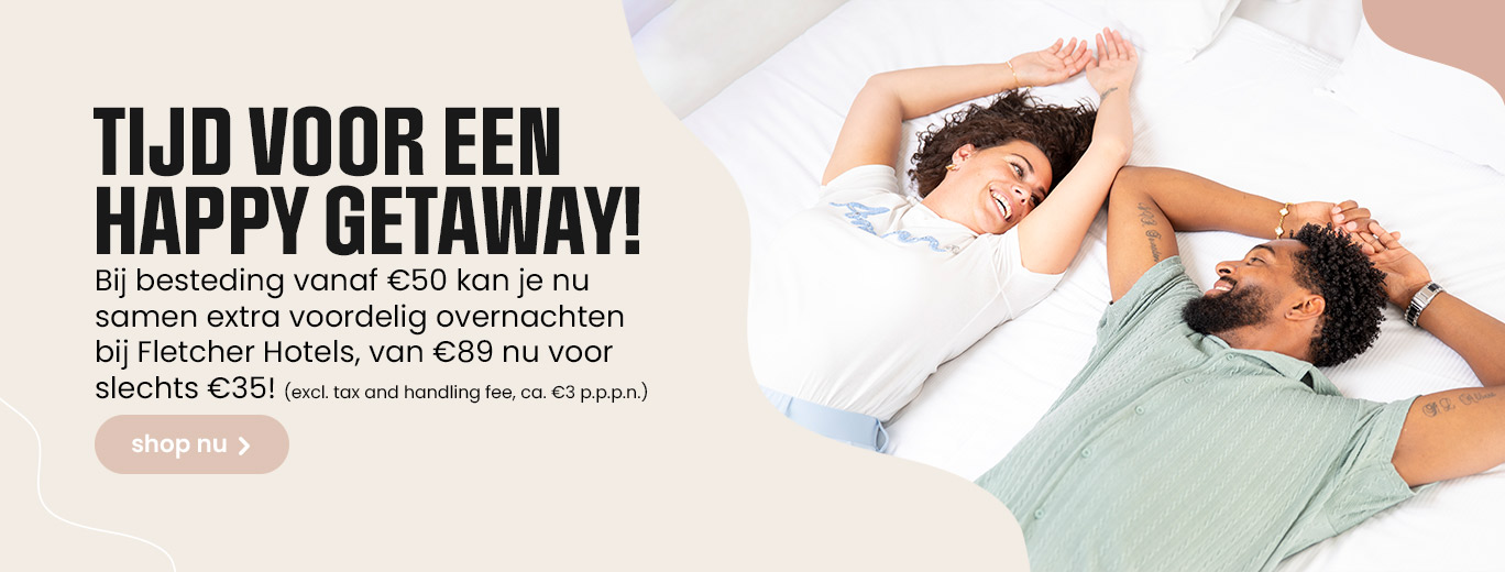 Tijd voor een happy getaway! Bij besteding vanaf €50 kan je nu extra voordelig overnachten bij Fletcher Hotels!