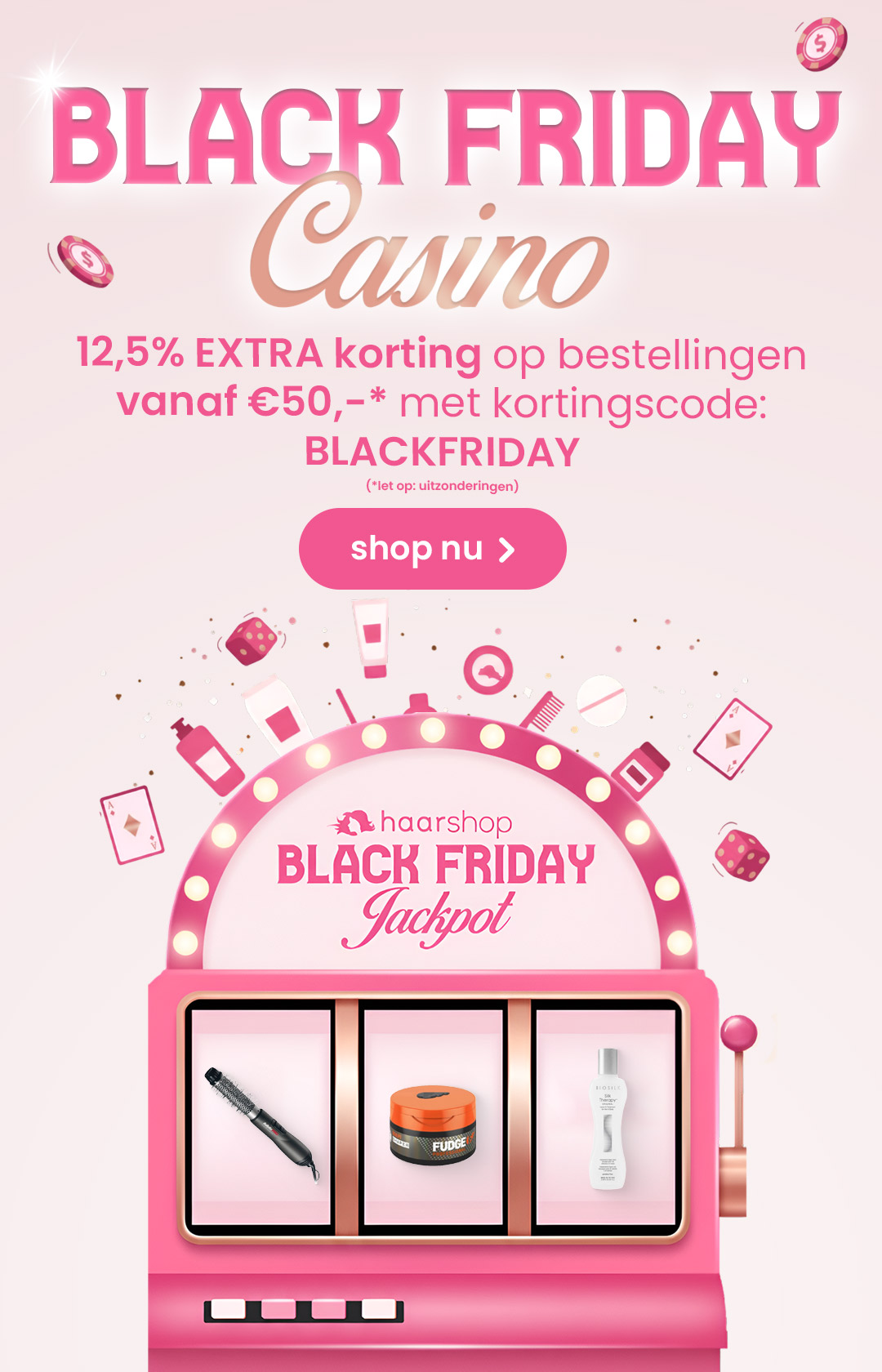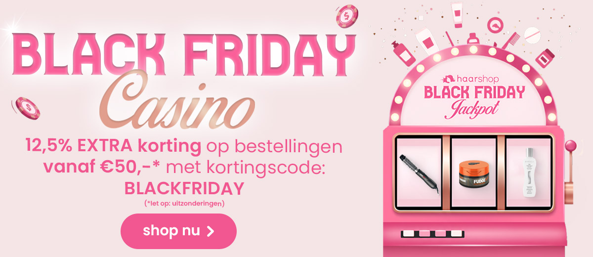 Vanaf maandag 24 november start het Black Friday Casino 2025 bij Haarshop.nl en liggen de tafels vol met cadeaus! Shop topmerken zoals L’Oréal Professionnel, Redken, Moroccanoil, Wella Professionals, Schwarzkopf Professional, Indola, ghd en meer. Voldoe aan de actievoorwaarden en ontvang een beauty-cadeautje.