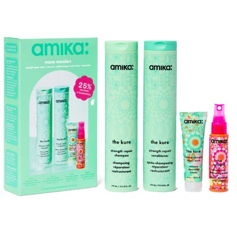 Amika – Mane Menders Strength Repair Wash + Care Set bevat vier krachtige producten die samen beschadigd haar herstellen, versterken en verzorgen. Deze full‑size en reisversies omvatten de Kure Strength Repair Shampoo, Conditioner, Intense Strength Repair Mask en The Wizard Silicone‑Free Detangling Primer. Geformuleerd met bond‑fortifying technologie en voedende oliën (zoals zeesappel, borage, avocado en mango), helpt deze routine haarbreuk te verminderen en de haarschacht te versterken — voor glanzend, sterk en gezond haar.
