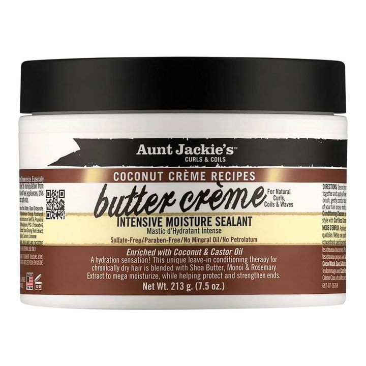 Aunt Jackie's Coconut Creme Butter Creme 213 gr lichtgewicht leave-in conditioner voor diepe hydratatie. Zeer geschikt voor droog haar met een lage porositeit. Beschermt tegen gespleten punten en haar dat te maken krijgt met hittetools. Geschikt voor krullend haar dat extra hydratatie kan gebruiken. Geschikt voor dagelijks gebruik.