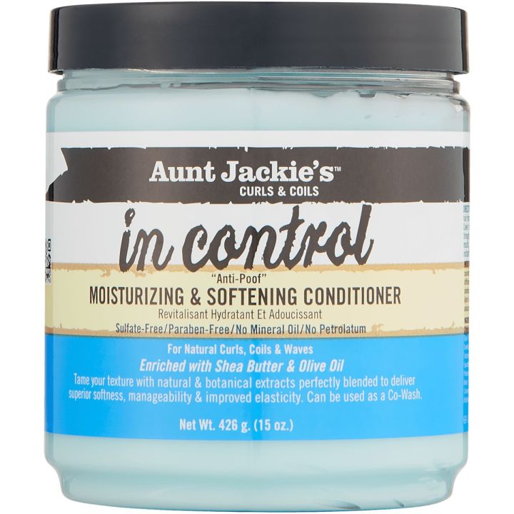 Aunt Jackie's In Control Conditioner 426 gr temt en voedt pluizig haar. Deze conditioner is een diep hydraterende behandeling voor ieder haartype en structuur. Geschikt voor gekleurd haar en kan dagelijks gebruikt worden na het wassen met shampoo. De toegevoegde sheaboter en olijfolie zorgen voor zacht, glanzend en sterk haar.