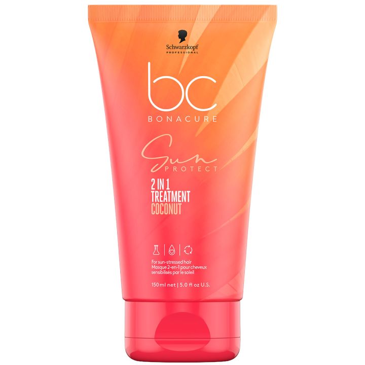 Schwarzkopf - BC Sun - 2 in 1 Treatment is een intensief voedende en herstellende behandeling speciaal ontwikkeld voor zonbelast haar. Deze multifunctionele formule hydrateert diep, helpt de vochtbalans te herstellen en maakt het haar direct beter handelbaar. Dankzij de anti-frizz werking en koudgeperste kokosolie wordt het haar ontward, pluis verminderd en krijgt het een prachtige, gezonde glans. De treatment helpt haarbreuk te verminderen en zorgt voor zacht, soepel haar na blootstelling aan zon, zee en chloor. De vegan formule maakt het ideaal voor iedereen die het haar wil herstellen en beschermen tijdens en na zonnige dagen.