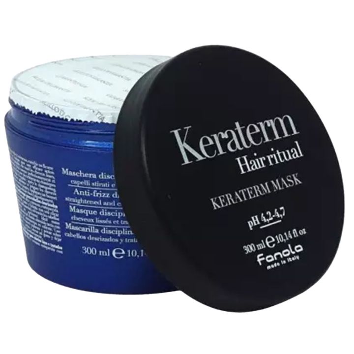 Fanola Keraterm Mask 300 ml maakt het haar pluisvrij en helpt bij het glad houden van gestyled haar. Dit anti-frizz masker is perfect voor wanneer je haar een chemische behandeling heeft gehad. Het hydrateert het haar door de karité butter en maakt het haar glad en zacht. Hierdoor is het makkelijk je haar steil te houden wanneer je je haar hebt gestyled. Het zorgt ervoor dat je haar niet pluizig of statisch wordt.