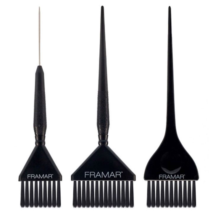 De Framar - Family Pack Haarverf Kwast - Zwart is een set met verfkwasten van drie verschillende formaten. De kwasten zijn geschikt voor root touch-ups, precisie en meeste toepassingen tijdens een kleurbehandeling. Alle kwasten bevatten accusoft haren, de perfecte mix van zachte en stijve haren om de colorist controle te geven. De kwasten hebben toelopende randen voor precieze en fijne lijnen.