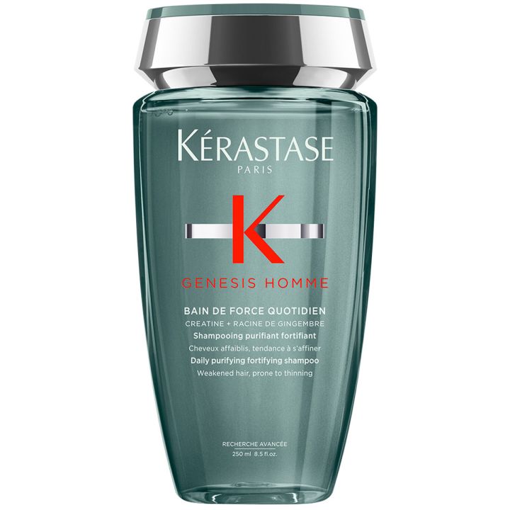 Kérastase Genesis Homme Bain de Force 250 ml is een versterkende shampoo voor mannen met haaruitval en vet haar. Deze shampoo reinigt haar en baard op een milde wijze. Overtollige olie en vuil wordt met deze shampoo efficiënt gereinigd. De shampoo laat het haar herstellen en versterkt dunner wordend haar. De formule bevat creatine wat ervoor zorgt dat bestaande haarvezels direct voller ogen. Gemberwortel is een ingrediënt welke is toegevoegd om het haar te beschermen voor aanvallen van buitenaf. Zo wordt de hoofdhuid en de omzet van haarcellen gestimuleerd. Het haar voelt 88% zachter en 79% sterker aan na gebruik van deze shampoo.* Waar ruim 81% van de consumenten aangeeft dat de shampoo de hoofdhuid verfrist en weer energiek aanvoelt.