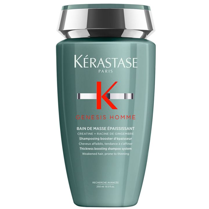 Kérastase Genesis Homme Bain Masse 250 ml is een shampoo wat verzwakt en dunner wordend en droog haar volume geeft. Deze haarverdikkende shampoo gaat haaruitval tegen en laat zwak en gevoelig haar weer herstellen. De ingrediënten Creatine en Gemberwortel zorgen voor een sterkere haarvezel en bouwt hierdoor weerstand op. Haarbreuk wordt op deze manier voorkomen en het haar oogt tot wel 5 keer voller! Geniet weer van zacht haar wat ook nog eens gezond oogt.