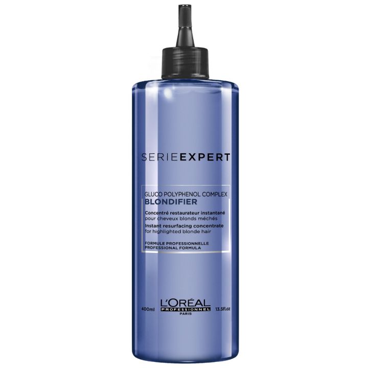 L'Oréal Professionnel Blondifier Restoring Concentrate is een herstellend concentraat voor geblondeerd haar. De professionele treatment herstelt de integriteit van de haarvezel na ontkleuring, door de haarelasticiteit te verbeteren. Zorgt voor wel 80% minder haarbreuk en geeft een maximale verzorging aan het haar. De sublieme glans blijft tot 48 uur lang behouden. Ook helpt het de haarvezel beschermen tegen schadelijke invloeden van buitenaf. Blondifier Restoring Concentrate is aangeraden voor gebruik na iedere ontkleuringsservice.
