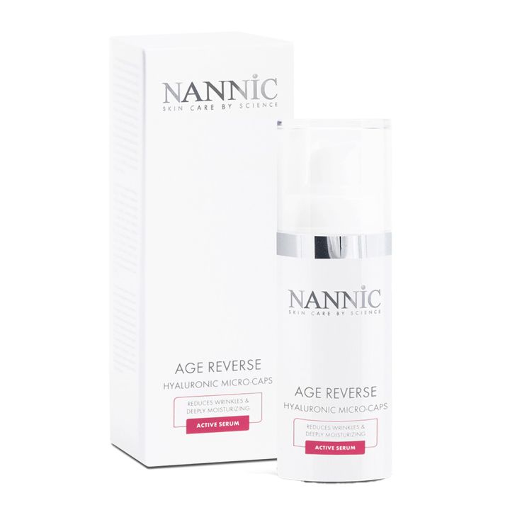 Nannic Age Reverse Active Serum anti huidveroudering met een zeer krachtige werking! Nannic bewijst dat je huidveroudering wel degelijk tegen kunt gaan en maakt je huid weer gezond en zeer zacht! Vanaf je 50ste levensjaar neemt de hoeveelheid hyaluronzuur in je lichaam met de helft af. Met Age Reverse van Nannic herstel je dit proces en stimuleer je de aanmaak van hyaluronzuur weer! Age Reverse is te gebruiken als een huidserum, met een dubbele hydraterende werking. Rimpels worden van binnen naar buiten gedrukt dankzij omdat de vochtbalans van je huid weer wordt herstel!