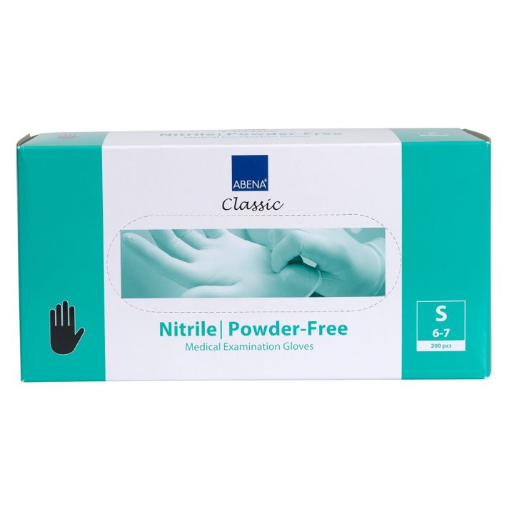 De poedervrije Abena Nitril Handschoenen Maat S zijn verpakt in een doos met 100 handschoenen.