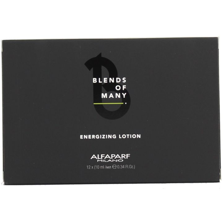 Alfaparf Blends Of Many - Energizing Lotion 12 x 10 ml is een Intesieve behandeling voor verzwakt haar, moedigt haargroei aan en stimuleert dikte en volume. De Alfaparf Blends Of Many Energizing Lotion 12x10 ml is een intensieve behandeling voor verzwakt haar. Het energizing lotion moedigt haargroei aan, stimuleert dikte en volume. Verrijkt met: Urban Defense Pro: deze technologie is ontworpen om het haar te beschermen tegen de schadelijke effecten van vervuiling, voorkomt dat stof en zware metalen het haar binnendringen en de productie van vrije radicalen veroorzaken. Zwarte thee, een natuurlijk actief ingrediënt met 3 fundamentele voordelen: anti-oxidant kalmeert de geïrriteerde huid, stimuleert de microcirculatie en follikelactiviteit van de huid. Geeft het haar nieuwe energie, waardoor het zacht en glanzend blijft. Biopower-sterkte: behandelt haarverlies, versterkt de haarzakjes.