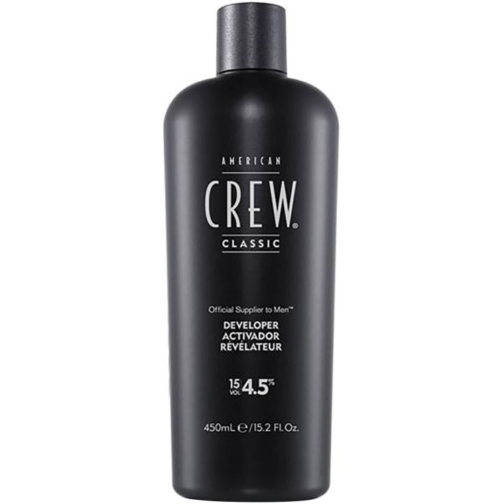 American Crew - Precision Blend - Developer 4,5% (15 Vol) - 450 ml is ideaal voor wie graag de verschijning van grijze of witte haren wil verminderen. Als onderdeel van de bekende Precision Blend lijn, biedt dit product een uitkomst voor het optisch terugdringen van verminderde pigmentatie in je haar. Niet alleen zorgt deze developer voor een natuurlijke 'gray blending', maar hij verhoogt ook het volume, waardoor je haar er voller uitziet. Elke fles biedt voldoende voor ongeveer 11 behandelingen, waardoor je langdurig kunt genieten van professioneel ogende resultaten. American Crew Precision Blend Developer werkt samen met de Precision Shades om tot een natuurlijk ogende haarkleur te komen die jouw persoonlijke stijl accentueert. Het gebruiksvriendelijke systeem is geschikt voor elk haartype en zorgt ervoor dat je de kleur behoudt die je verkiest, terwijl je je haar gezond houdt.
