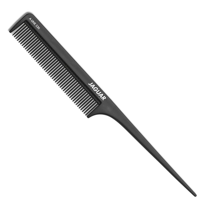 De Jaguar A-Line A530 is een zwarte puntkam met een lengte van 8.25 Inch, ofwel 21 centimeter. Het materiaal is kunststof, maar verrijkt met ionische eigenschappen waardoor statisch haar geen schijn van kans maakt. Over het uiterst stijlvolle, met de hand vervaardigde design, valt natuurlijk te twisten.