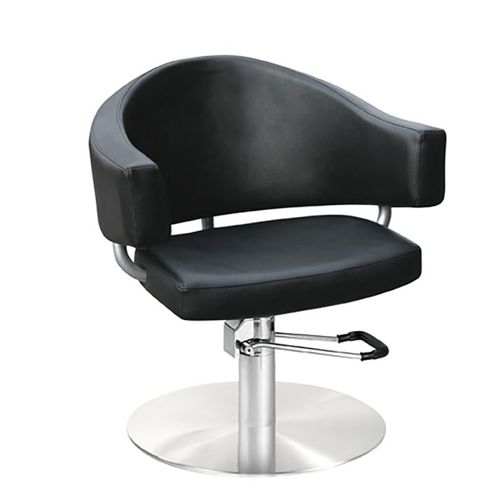 Kappersstoel met hydraulische vergrendelbare pomp, ronde metalen voet, zithoogte verstelbaar van 48-60 cm, BD 65x49 cm. Zwart imitatieleer.