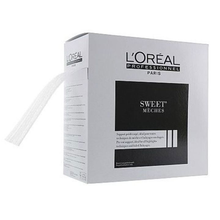 L'Oréal Sweet' Mèches papier is ideaal voor alle ingepakte highlight en coupe soleil technieken. Het papier scheidt de ingepakte lokken af van de rest van het haar en bevordert de werking van de ontkleurende pasta's, zodat het haar nauwkeurig en regelmatig wordt opgelicht en de totale haarvezel perfect wordt gerespecteerd.