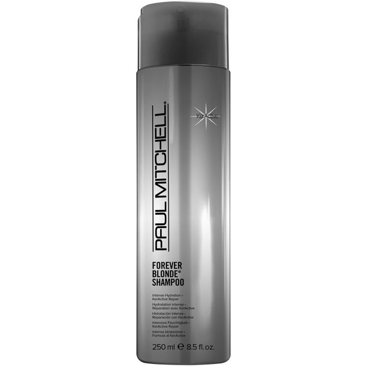 Paul Mitchell Forever Blonde Shampoo is een sulfaatvrije shampoo speciaal ontwikkeld voor blond, gebleekt en chemisch behandeld haar. Het reinigt het haar voorzichtig, herstelt schade en voedt intensief met veganistische KerActive-proteïne en botanic extracten zoals kamille en saffloerolie. De shampoo helpt blonde tinten te verhelderen, neutraliseert eventuele gele tonen en beschermt de hoofdhuid, terwijl het haar zacht, elastisch en glanzend blijft. Ideaal om de levensduur van blonde haarkleuren te verlengen en het haar gezond en licht te houden, geschikt voor dagelijks gebruik.