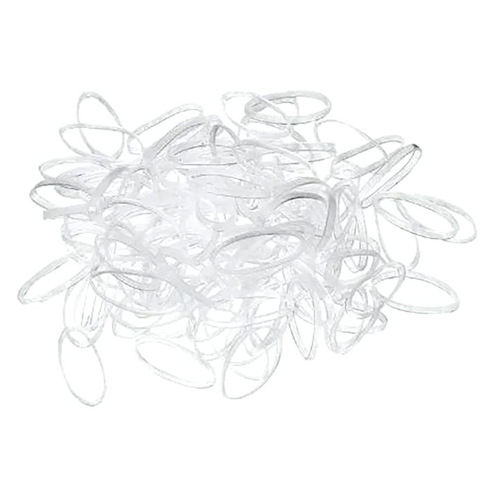 Dunne, transparante, rubberen elastiekjes met een diameter van 20mm verpakt in een doosje van 500 stuks. De elastiekjes zijn zeer geschikt voor het vastmaken van vlechtjes in het haar of van staartjes in fijn haar.