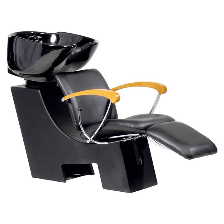 Hoogte bij gekantelde wasbak 97 cm, breedte 60 cm, diepte met voetsteun 140 cm, wasbak 50 cm breed x 38 cm diep, voetsteun diepte 38 cm. Bekleding stoel is uitgevoerd in zwart imitatieleer.