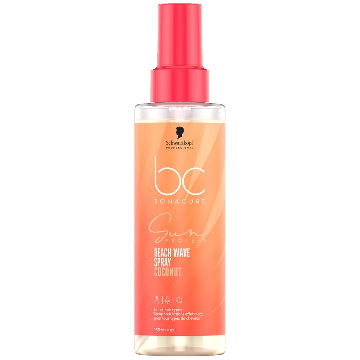 Schwarzkopf - BC Sun - Beach Waves - 150 ml is een gewichtloze texturespray die moeiteloos zachte, natuurlijke beach waves creëert zonder het haar knisperend te maken. Deze sugar mist is geschikt voor alle haartypes en geeft het haar een zomerse, nonchalante look met een subtiele glans. Dankzij de formule met koudgeperste kokosolie wordt het haar verzorgd en blijft het soepel en glad aanvoelen. De spray helpt bij het definiëren en reactiveren van golven, zowel op vochtig als droog haar. Perfect voor een beachy finish het hele jaar door. De vegan formule is vrij van siliconen en kunstmatige kleurstoffen.